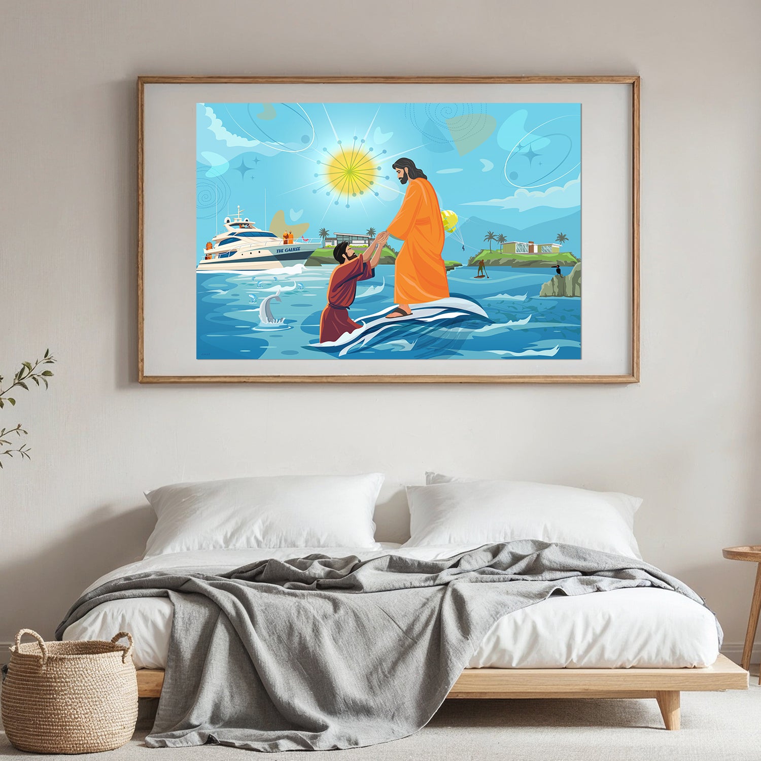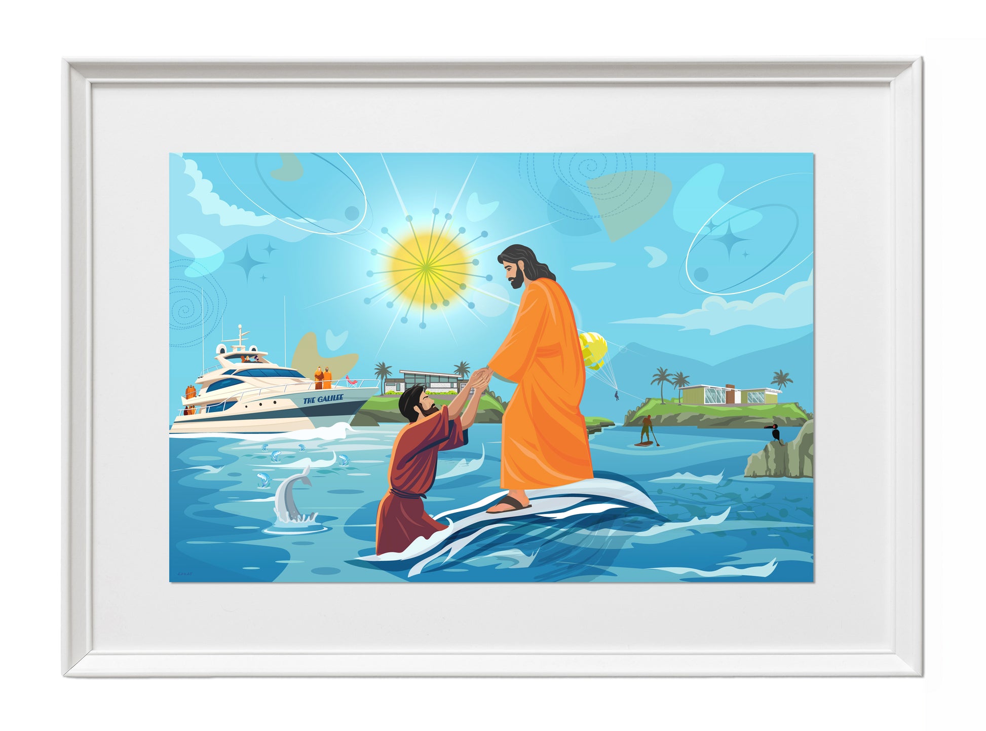 The artwork features Jesus and Peter on a stylized, undulating wave, set against a vibrant, resort-like scene on the Sea of Galilee. Jesus, with an outstretched hand, meets Peter's, creating a focal point of trust and salvation. The modern elements—a sleek yacht named "The Galilee," a parasailer, and mid-century modern beach houses—bring the ancient story into a contemporary context.