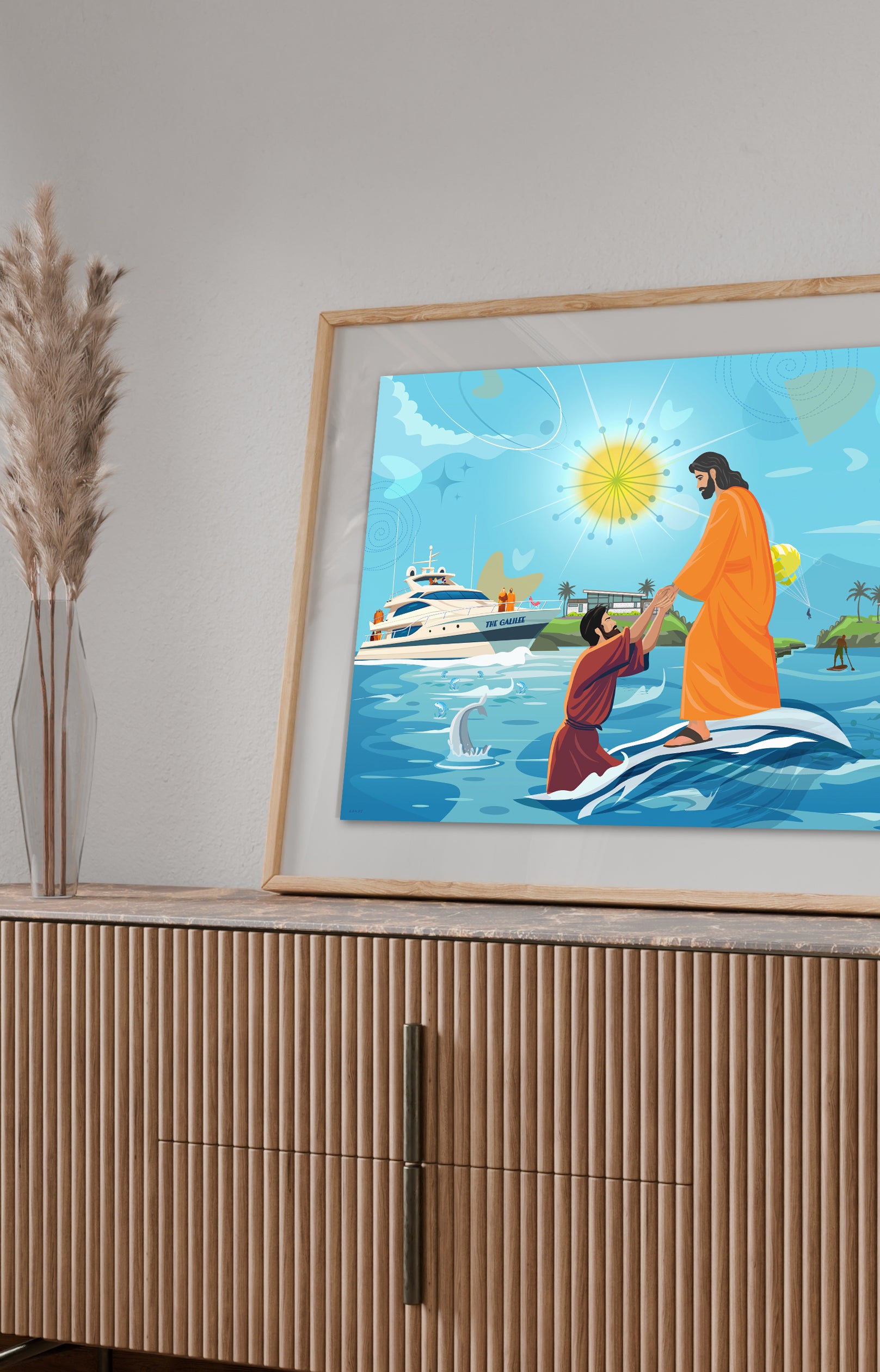 This captivating mid-century modern art print, The Trusting Current, visually interprets the powerful biblical story of Jesus walking on water and reaching out to a sinking Peter. It's a modern, stylistic take on a timeless lesson in faith and courage.